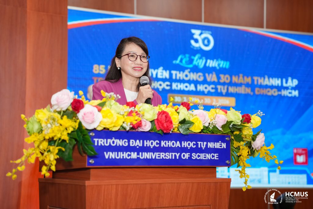 Phát biểu tại buổi Lễ, GS.TS Nguyễn Thị Thanh Mai – Giám đốc ĐHQG-HCM chia sẻ: “Là một nhà khoa học trưởng thành từ chính môi trường này, tôi hiểu giá trị của từng giờ nghiên cứu, từng giờ giảng dạy, từng công trình được hình thành, có thành công nhưng cũng nhiều thất bại, có những giá trị không ồn ào mà chỉ hình thành trong sự nhẫn nại, có những sự thân thương vô hình mỗi khi quay trở về. Tôi thấu hiểu những khó khăn mà nhiều thế hệ viên chức, người lao động đã phải đối diện, từ cơ sở vật chất còn hạn chế, nguồn lực đầu tư chưa tương xứng, áp lực hội nhập quốc tế ngày càng lớn”. Giám đốc ĐHQG-HCM cũng bày tỏ kỳ vọng Nhà trường sẽ không chỉ là một đơn vị xuất sắc trong hệ thống, mà còn là đơn vị tiên phong, dẫn dắt về chuẩn mực khoa học, về chiều sâu nghiên cứu và về khát vọng vươn ra thế giới.